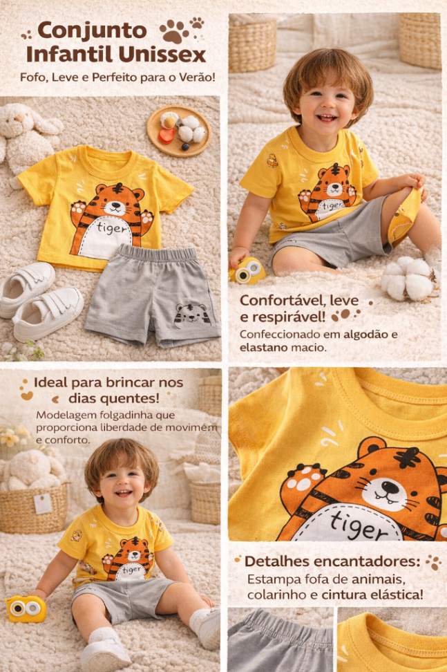 O Conjunto Infantil Unissex é a escolha perfeita para os dias quentes, unindo conforto, leveza e um estilo fofo que encanta meninos e meninas. Desenvolvido para proporcionar liberdade de movimento, é ideal para o uso diário das crianças.