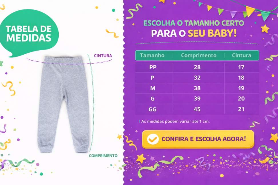 ➡️ Consulte a tabela de medidas antes de finalizar a compra para garantir o tamanho ideal para o seu bebê.