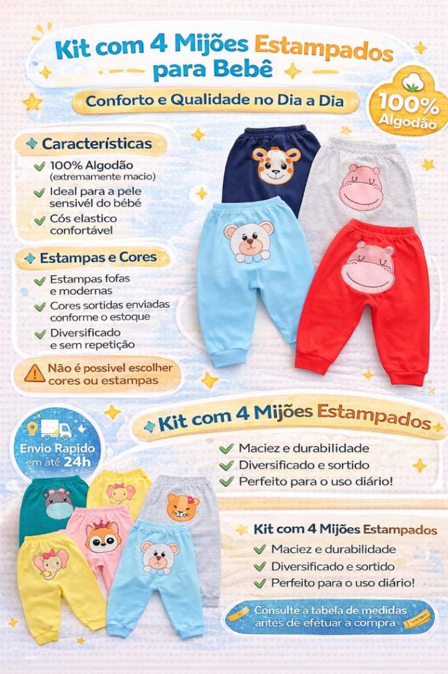 Este Kit de Mijões Estampados é ideal para o dia a dia, oferecendo maciez, praticidade e excelente durabilidade.